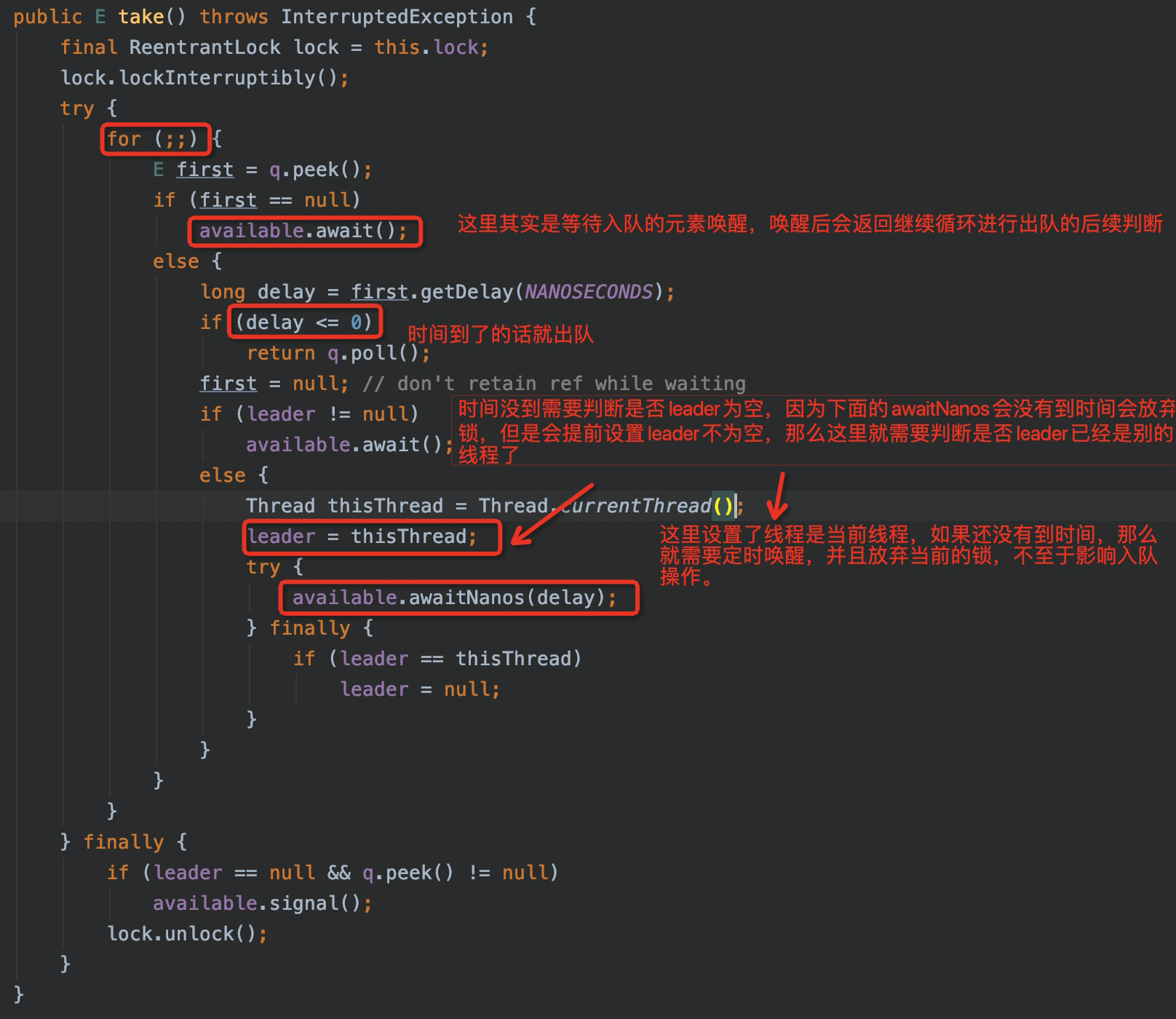 leader变量其实是leader-follwers模式的一个变体,用于尽量减少不必要的等待,当一个线程调用队列的take方法变为leader线程后,会调用available.awaitnanos(delay)等待delay时间,其他followers线程会调用await进行无限等待。leader线程到时间,会退出take方法,并且会available.signal唤醒一个follwer线程成为新的leader线程。