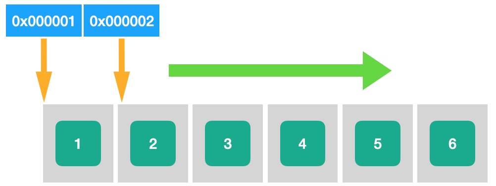 我们知道计算机中的内存都是连续的,如上图所述,1-6个元素按照顺序存储的方式存到内存里,比如第一个元素的内存地址是