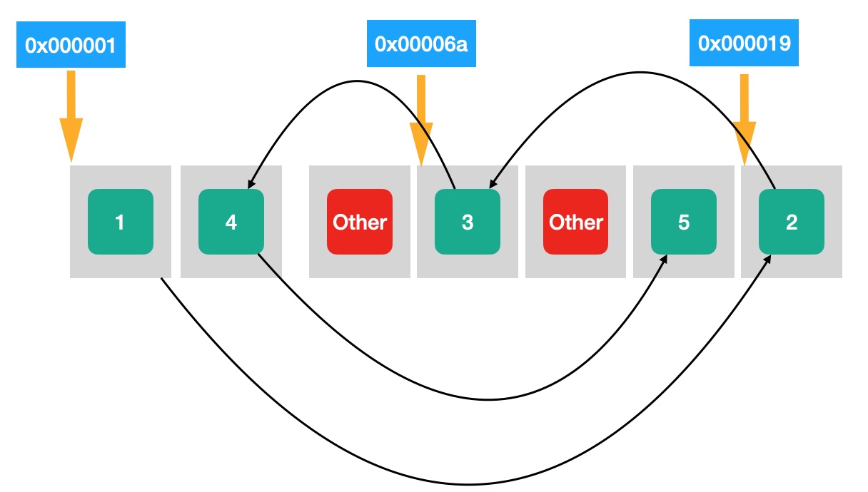 这里我画了一个简单的图,大概描述了一下链式存储在内存中是如何体现的。当我们的元素在内存中是散乱的,也就是他们的地址之间没有一定的规律,这个时候就要靠我们的指针去标记位置了,比如我们把