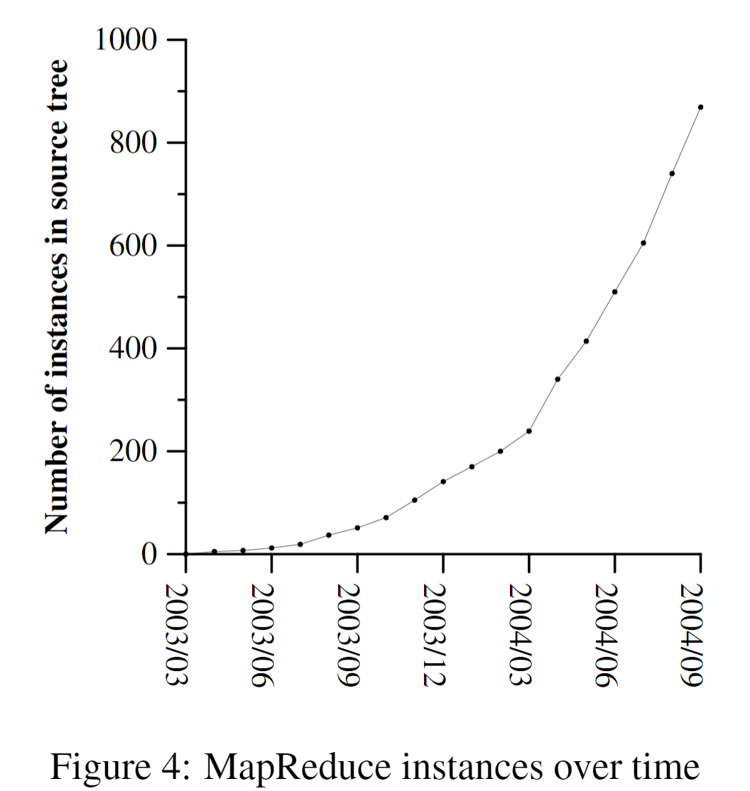 Figure 4 显示了在我们的主要源代码管理系统中,随着时间的推移,MapReduce程序在数量上显著的增长。从2003年一开始的0个MapReduce程序,到2004年9月已经有了差不多900个不同的MapReduce程序实例。MapReduce是如此的成果,因为它使得编写一个简单的程序并在半小时内在一千台计算机上高效运行它成为可能,从而极大地加快了开发和原型开发周期。此外,它允许没有分布式或者并行系统经验的程序员轻松地去利用这些资源。