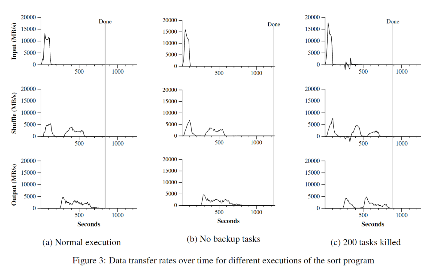在Figure 3 (b)中,我们展示了一个禁用备用任务的排序任务的执行过程。该执行过程和Figure 3(a)中所示的类似,除了最后这段时间的尾巴很长,几乎没有任何写入活动发生。在960秒后,除了最后5个reduce任务以外,其他任务全部完成了。然而,这些最后几个拖后腿的任务花了300秒才完成。整个计算过程花了1283秒,多了44%的执行时间。