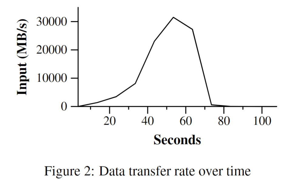 左下方的图像表示的是Reduce任务将排序后的数据写入到最终的输入文件时的速度。在第一次shuffle阶段结束后和写入阶段开始前,它们之间存在了延迟。因为机器会忙于对中间数据进行排序。硬盘的写入速度会处于2-4GB/s,并且这个速度会持续一段时间。所有的写入需要花费850秒才能完成。包括启动开销,整个计算过程花费了891秒。这个速度和TeraSort benchmark中的当前最佳纪录差不多。