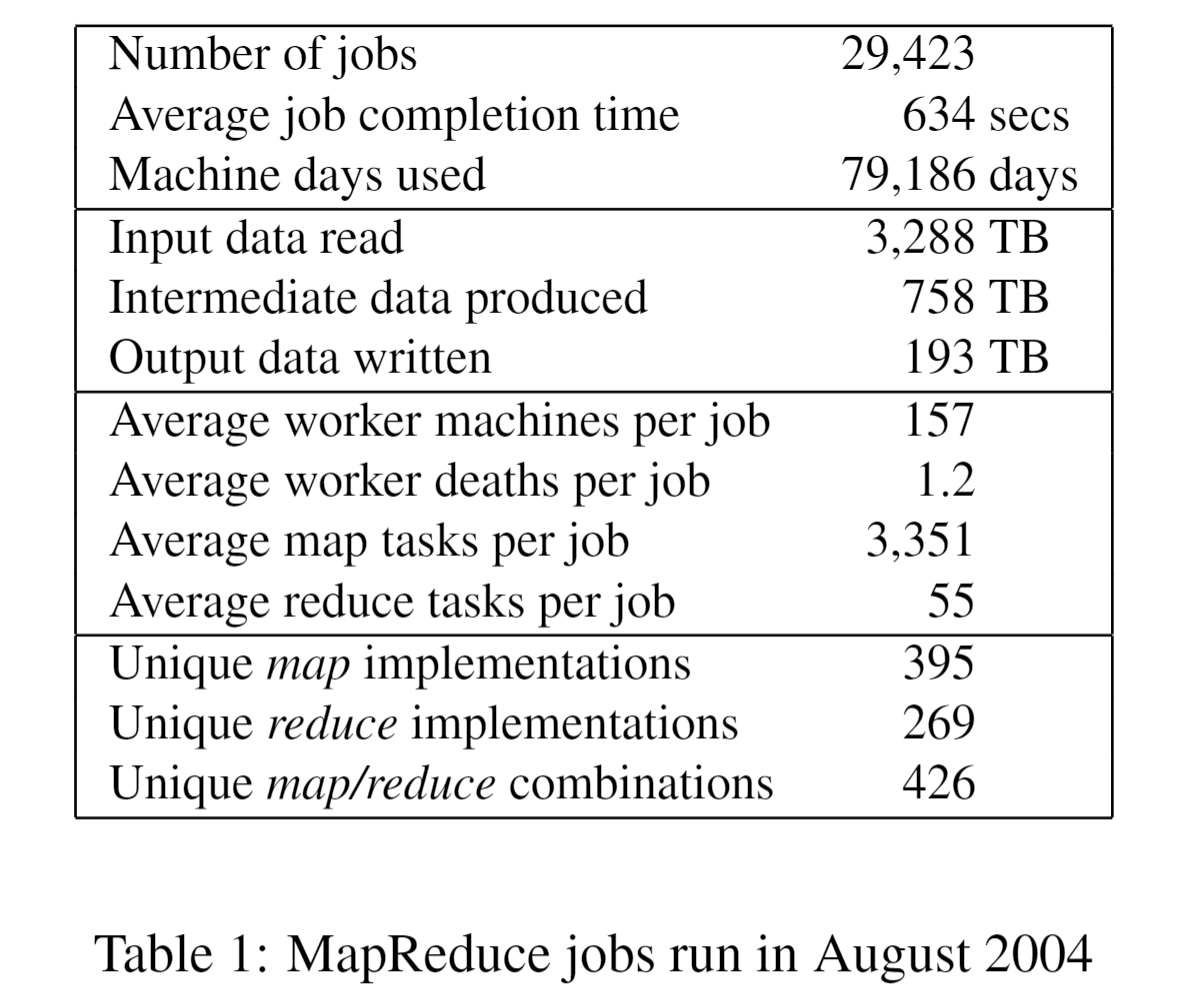 在每项job完成后,MapReduce库会以日志的方式记录下该job所利用的计算资源的数据。在Table 1中,我们展示了谷歌在2004年8月所运行的MapReduce job中某个子集的运行数据。