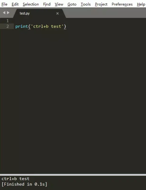 保存好之后,重启编辑器,然后新建一个test.py,输入代码,运行(ctrl+b)测试程序是否成功,记得保存文件后测试