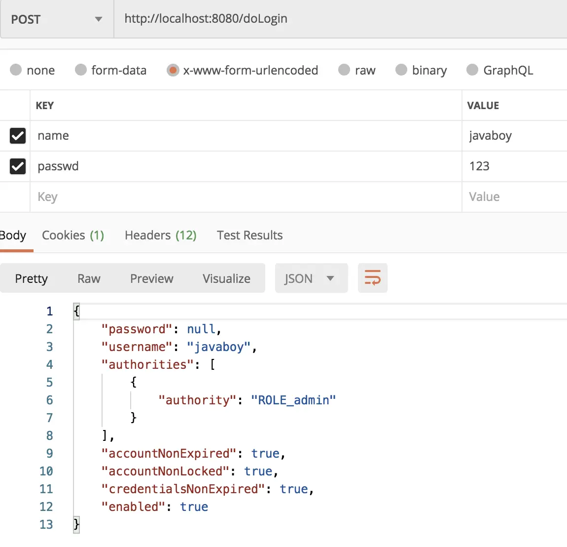 配置完成后,我们再去登录,就可以看到登录成功的用户信息通过 JSON 返回到前端了,如下:
