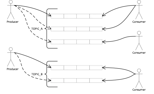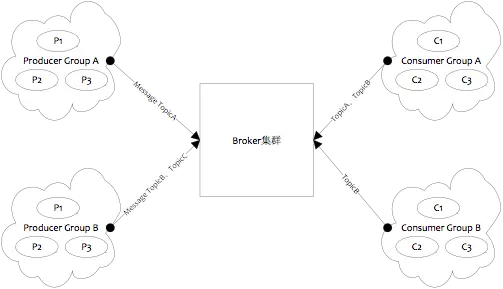 - Producer向一些队列轮流发送消息,队列集合称为Topic,Consumer如果做广播消费,则一个consumer实例消费这个Topic对应的所有队列,如果做集群消费,则多个* Consumer实例平均消费这个topic对应的队列集合。