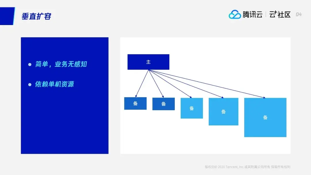 大家可以看到,这整个过程当中,对业务来说基本上没有什么影响——进行主备切换,如果换IP的话,其实是通过前端的或者VIP的方式,对业务来说基本上没有什么影响。那么它一个最大的不好的地方就是,它依赖于单机资源:你可以给它提供一个更好的机器,从而满足一定量的要求。而随着业务更加快速的发展,你会发现现在能提供的最好的机器,可能还是满足不了,相当于扩不下去了。因此,垂直扩容最大的缺点就是,它依赖于单机的资源。