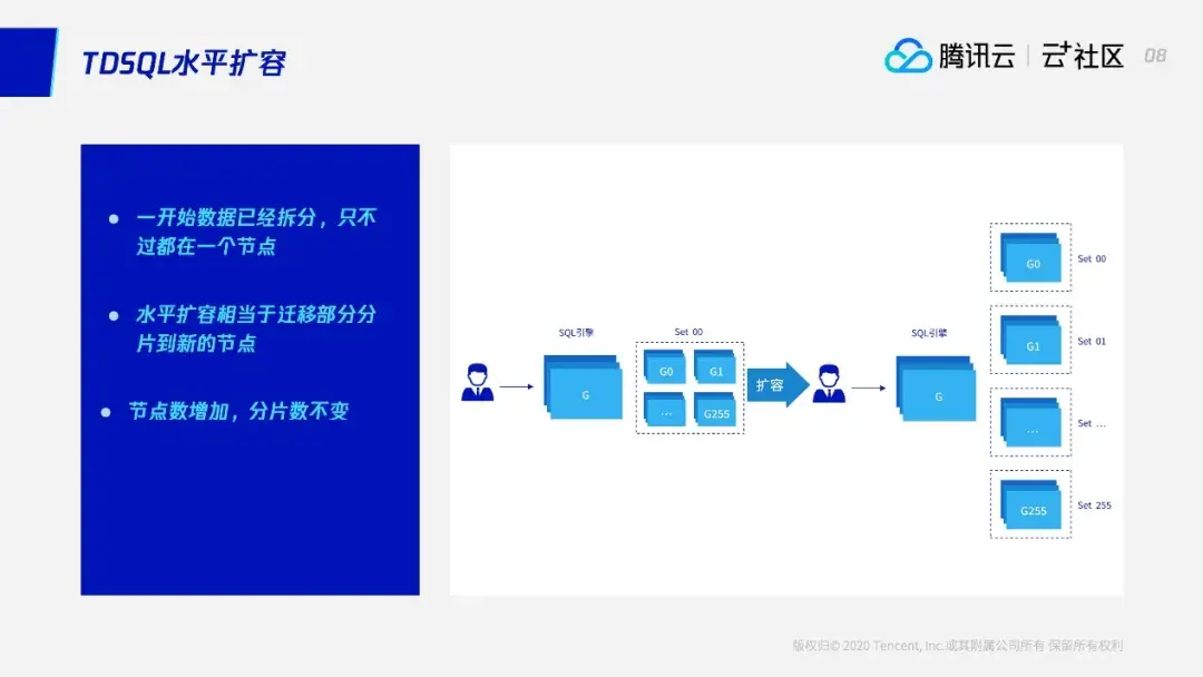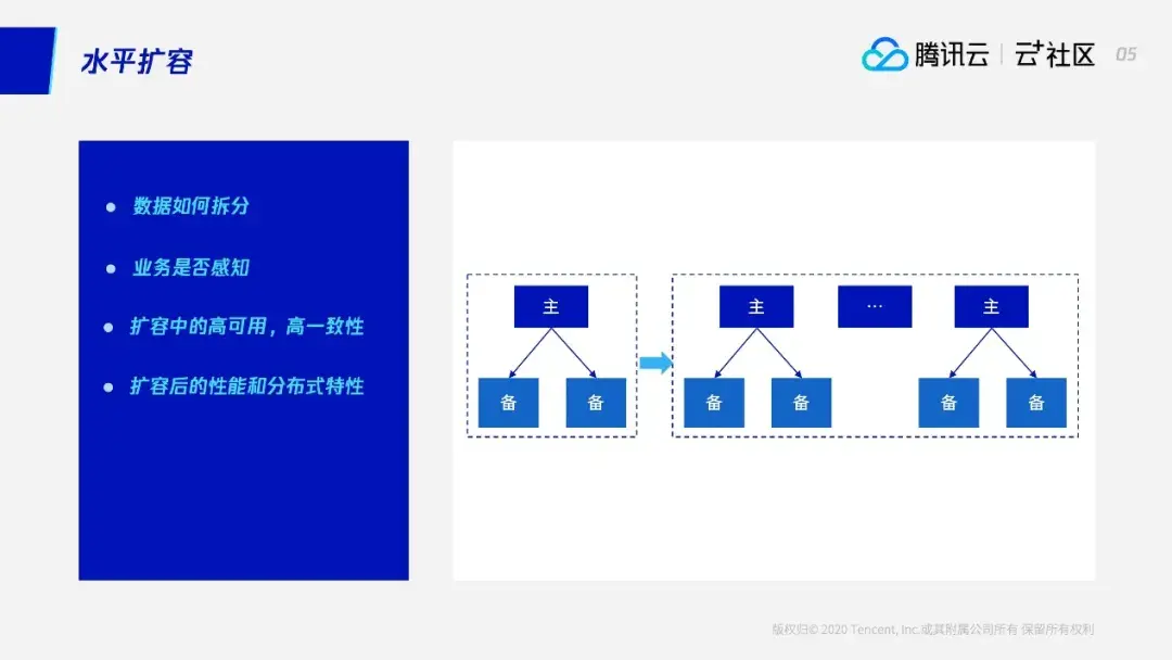 所以大家可以看到,水平扩容的优点很明显,它解决了垂直扩容机器的限制。但是它更复杂,引入了更多的问题。接下来大家带着这些问题,下面我会介绍TDSQL如何进行水平扩容,它又是如何解决刚才说的这些问题的。