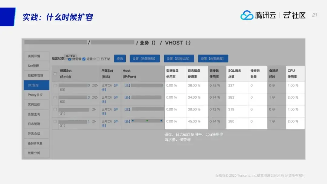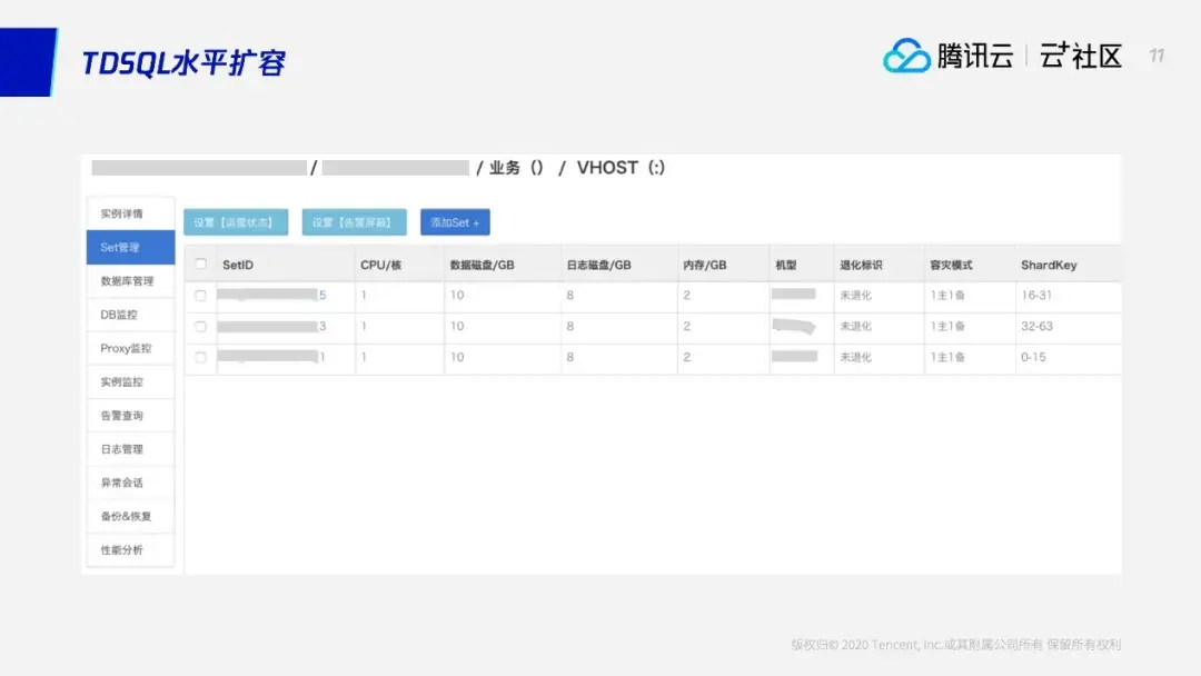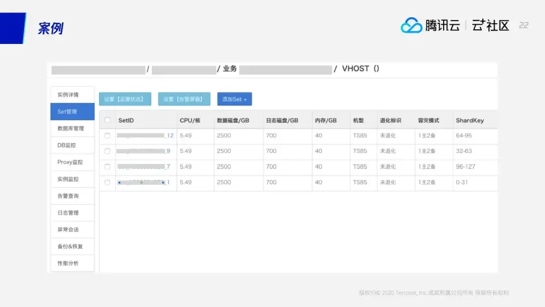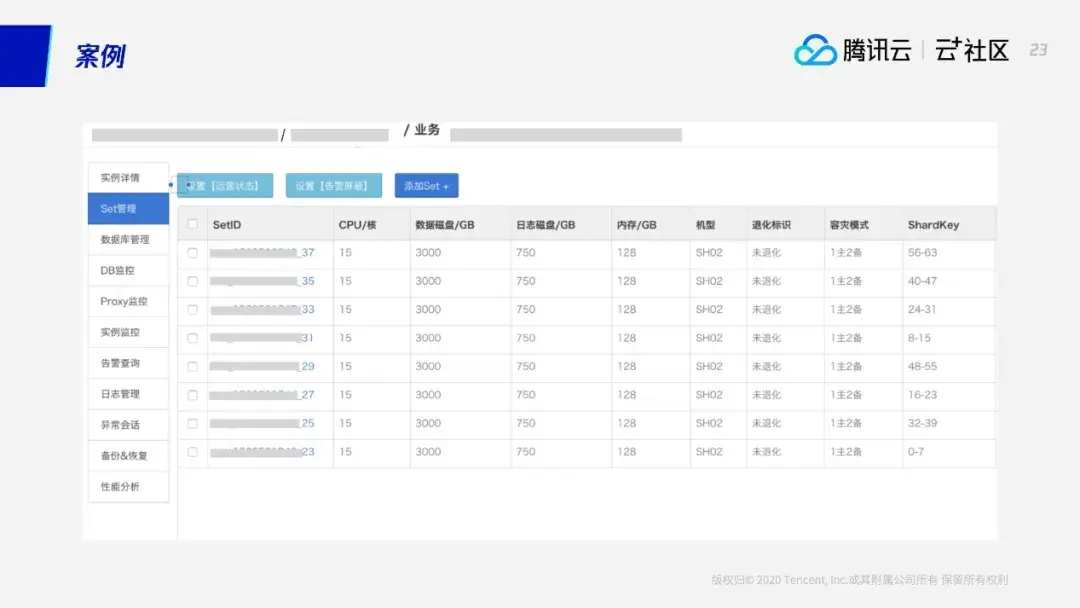 下面再看几个云上的集群案例。这个大家看到,这个集群有4个SET,每个SET负责一部分的shardkey,这个路由信息是0-127,意思是它最后能扩到128个节点,所以能扩128倍。这个“128”可以由初始化的业务预估先定下来。因为如果池子太大的话,的确最后可以扩到几千台,但是数据将比较散了。事实上今天每台云上的或者实际的机器性能已经非常好,不需要几千台的规格。