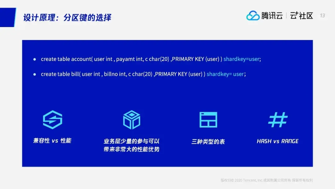 其实我们也可以做到用户创建表的时候不指定shardkey,由我们底层这边随机选择一个键做数据的拆分,但这个会影响后续的使用效率,比如不能特别好地发挥分布式数据库的使用性能。我们认为,业务层如果在设计表结构时能有少量参与的话,可以带来非常大的性能优势,让兼容性和性能得到平衡。除此之外,如果由业务来选择shardkey——分区键,在业务设计表结构的时候,我们可以看到多个表,可以选择相关的那一列作为shardkey,这样可以保证数据拆分时,相关的数据是放在同一个节点上的,这样可以避免很多分布式情况下的跨节点的数据交互。