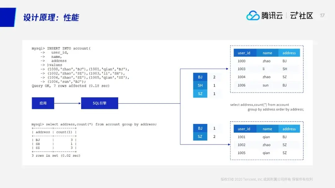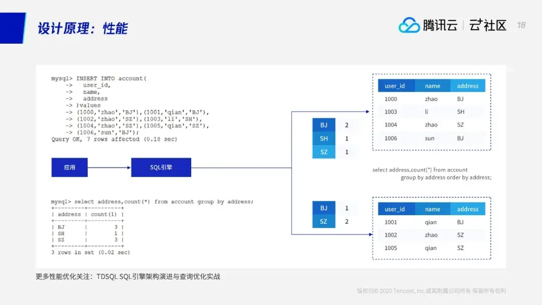 我们简单看一个聚合——TDSQL是如何做到水平扩容以后,对业务基本无感知,使用方式跟使用单机MySQL一样的。对业务来说,假设有7条数据,业务不用管这个表具体数据是存在一个节点还是多个节点,只需要插7条数据。系统会根据传过来的SQL进行语法解析,并自动把这条数据进行改写。7条数据,系统会根据分区键计算,发现这4个要发到第一个节点,另外3个发到第二个节点,然后进行改写,改写好之后插入这些数据。对用户来说,就是执行了这么一条,但是跨节点了,我们这边会用到两阶段提交,从而变成多条SQL,进而保证一旦有问题两边会同时回滚。