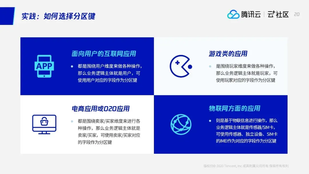 如果是面向用户的互联网应用,我们可以用用户对应的字段,比如用户ID,来做分区键。这样保证在拥有大量用户时,可以根据用户ID将数据拆分到各个后端节点。