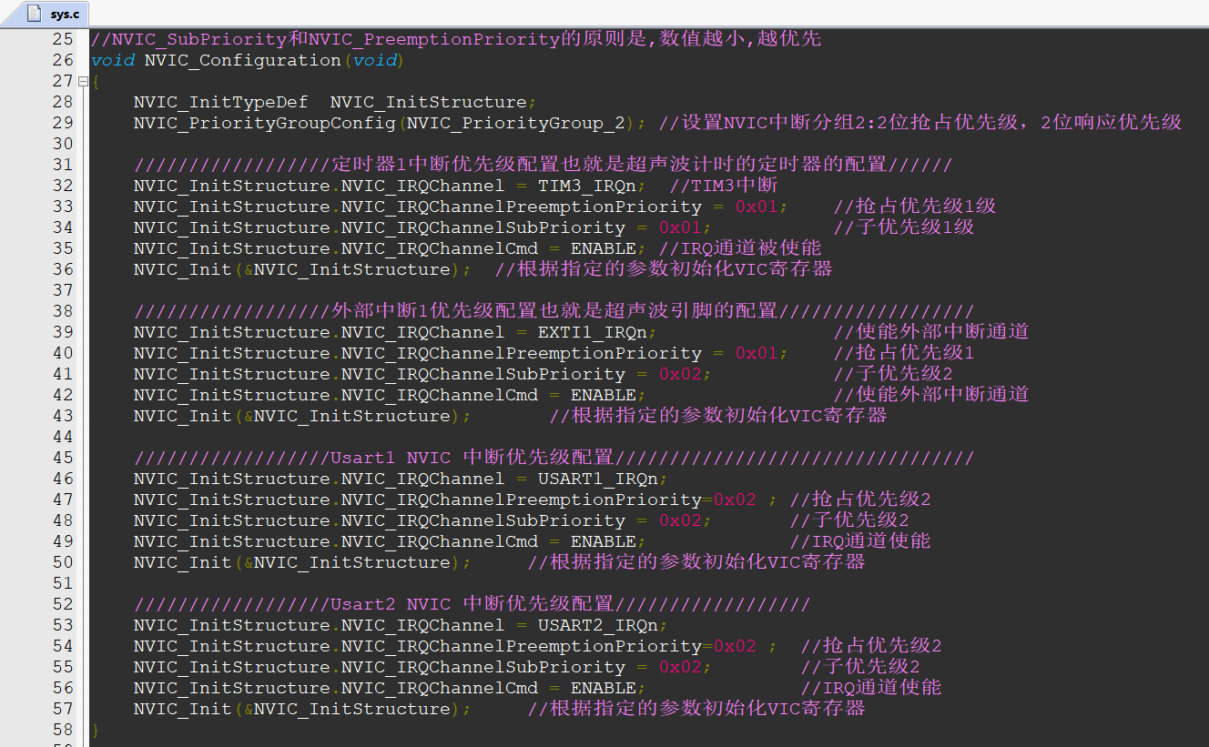 当然为了代码的美观,你可以那关于NVIC的代码,放到一起便于管理。就像这样,就可以清楚的看到响应的顺序