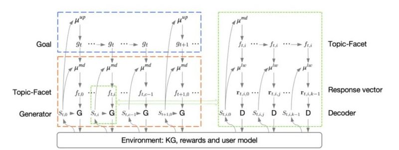 2、借助于知识图谱,该工作为对话策略(Dialog Policy)学习引入了显示的、可解释的对话状态与动作,不仅便于设计对话目标相关的Reward因子,还可使用对话目标以及细粒度话题指导回复生成。
