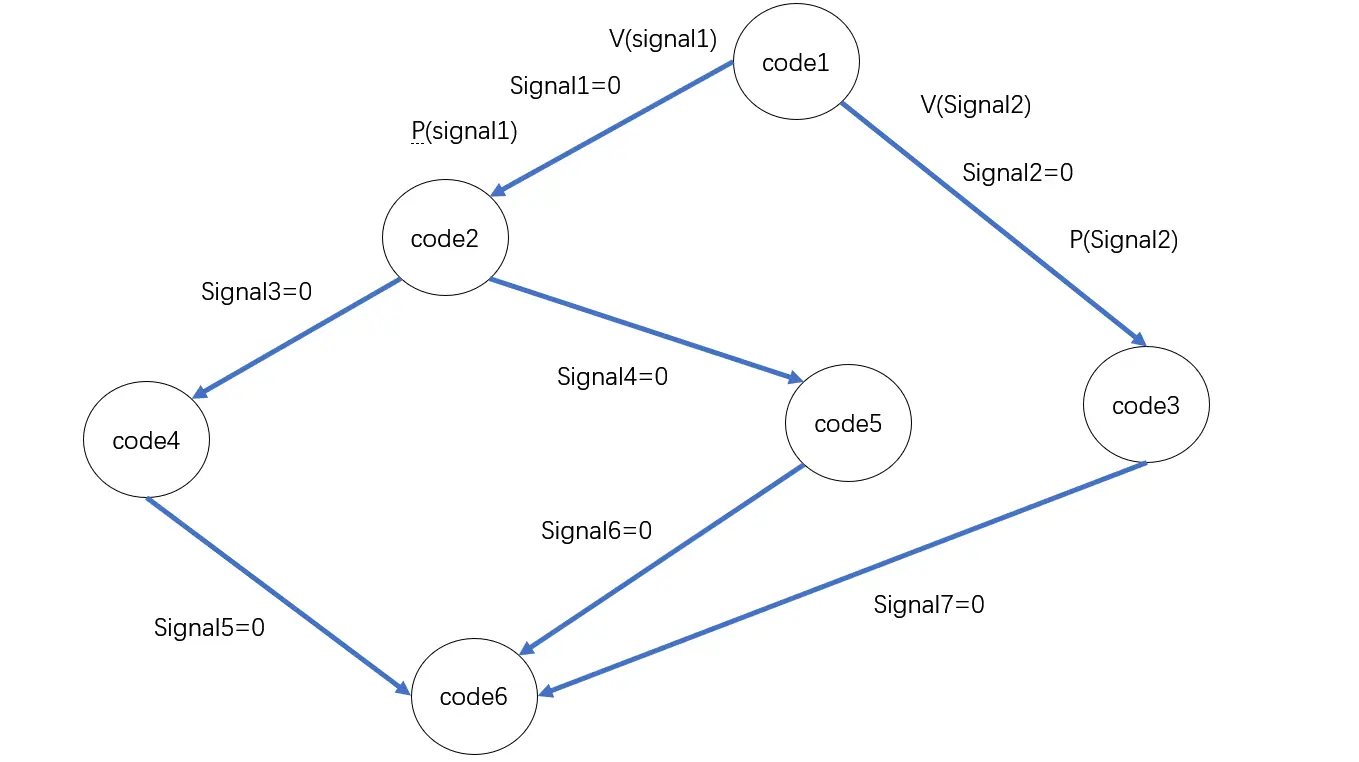 前面描述的都是两个进程的同步问题,但有时候也可能出现像下图这样多个进程互相依赖、有序运行的情况。其中,code * 语句仍然是前操作或者后操作,P1 进程有 code1 语句,P2 进程有 code2 语句...... 以此类推,这里要求六个进程必须按照箭头所指方向有序运行。