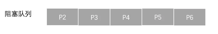 假设一开始是 P2 占有处理机,那么由于 signal1 初始为 0,导致了 P2 进队列,此后处理机来到 P3,P3 同样进队列....... 以此类推,阻塞队列就会变成: