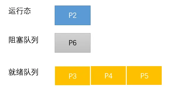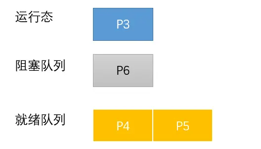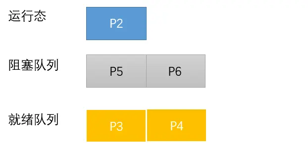 在 P1 的时间片完了之后,P2 占有处理机,value 由 0 变为 -1 < 0,前面我们说过,value < 0 说明无可用资源,所以此时 P2 将自己主动送到了阻塞队列。接着来到了 P3,value 由 -1 变为 -2,P3 同样进入阻塞队列。P2,P3 都从运行态转为阻塞态。