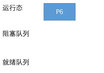 P4 执行完之后,处理机调度就绪队列队头的 P5 开始执行,P5 执行到 V(signal6) 的时候,signal6 加一,注意这一步没有唤醒任何进程(阻塞队列已经没有进程了)