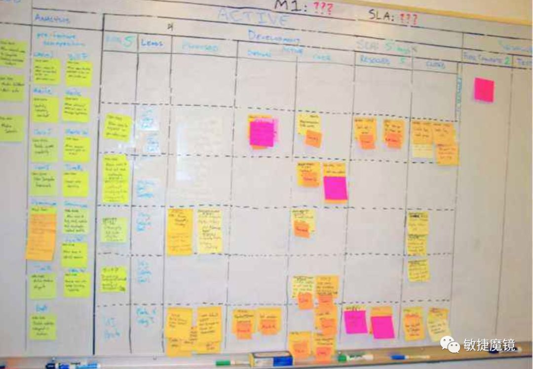 这块,跟你平常用的“TAPD故事墙”很像。将功能性需求、bug、技术改进等写在卡片上,这个卡片就叫做KANBAN,用卡片代表需求在状态池中流转,卡片在不同泳道间的流动过程,也表示了对应价值加工的过程,同时团队可以直观的从状态池中发现和可视化问题,促使问题尽快解决,消除阻碍价值流程的因素,比如用红色卡片表示阻塞和问题,我们能一眼看到哪里有阻塞,可视化的价值流在我们平时使用的物理板中也能看到