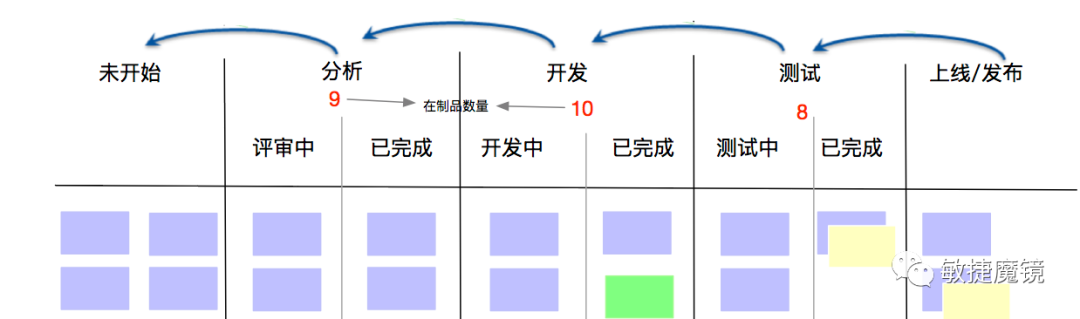 这一点,更容易被我们团队日常运作忽略。限制各阶段的在制品(需求)最大数量(包含进行中和已完成的),在制品小于上限,可以从上游环节拉取新的工作,若在制品达到超过上限,则不能再从上游拉取工作,形成从下游向上游的拉动机制。你可以对照上面的图理解一下,你常见的物理板其实可以算作是简化了的KANBAN流,它只包含了可视化的价值流,显示化的流程规则和在制品数量没有做明确的规定。
