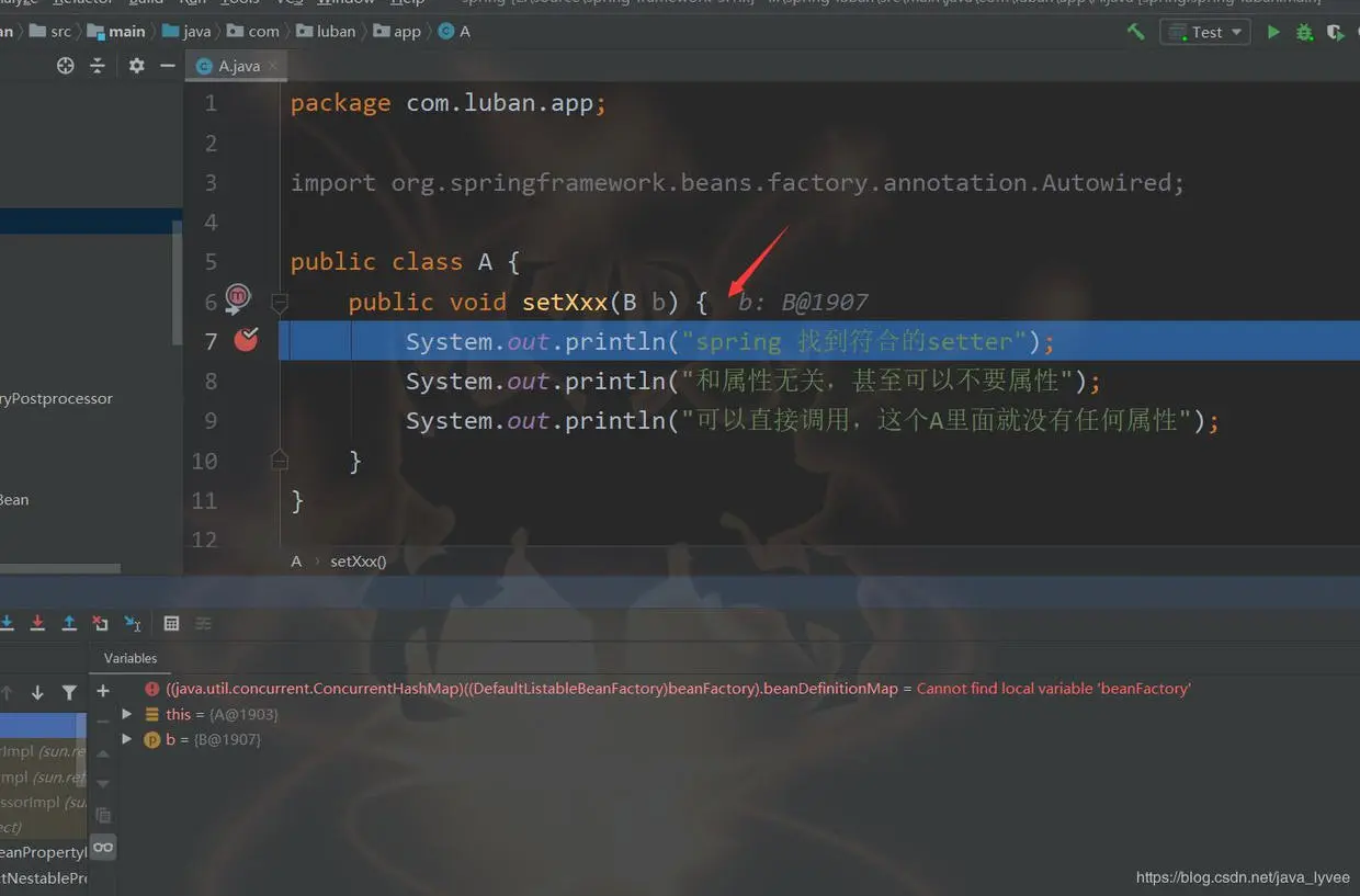 运行上面的代码可以看到spring也会调用这个setXxx方法,如果仔细观察调用栈可以看到这个方法是在spring容器初始化的时候实例化A,完成A的注入功能时候调用过来的,下图是笔者运行结果的截图