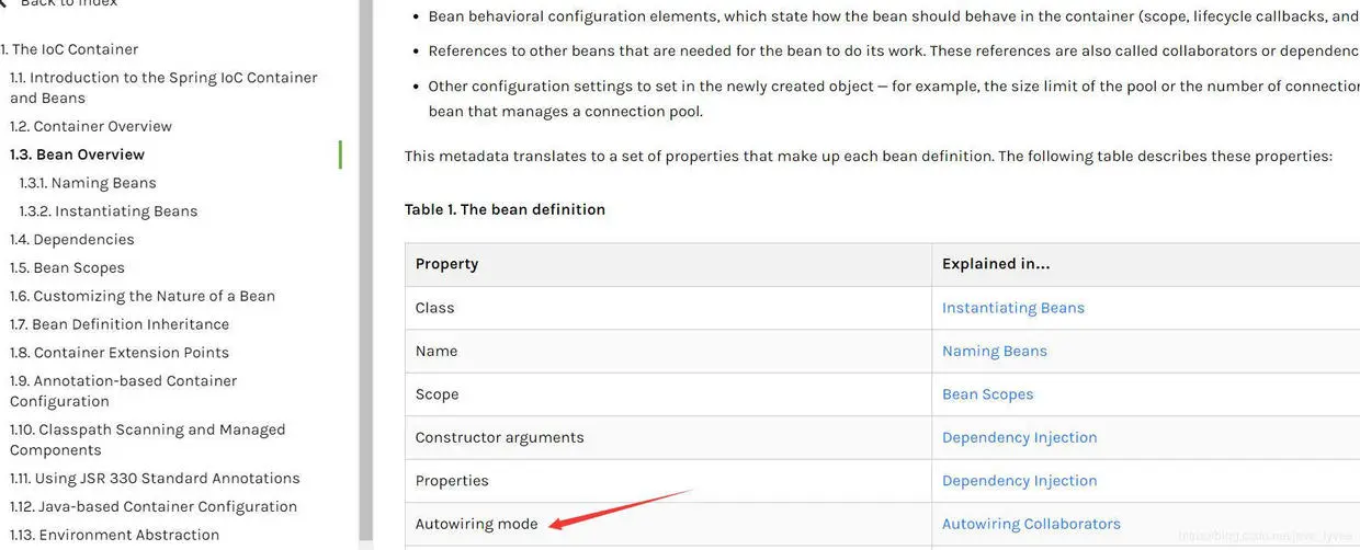 上面代码运行起来,A能注入B,但是在xml配置文件中并没有去手动维护、描述他们之间的依赖关系,而是在xml的根标签上面写了一行default-autowire=“byType”,其实关于自动注入的歧义或者被人误解的地方就是这个default-autowire="byType"引起的;那么这行代码表示什么意思呢?表示所在配置在当前xml当中的bean都以bytype这种模式自动装配(如果没有特殊指定,因为bean还可以单独配置装配模式的);这需要注意笔者的措辞,笔者说的bytype这自动装配模式,是一种模式,这个不是笔者信口开河,因为在官网文档里面spring也是这么定义的 首先官网介绍beanDefinition这一章节的时候有提到bean的Autowiring mode