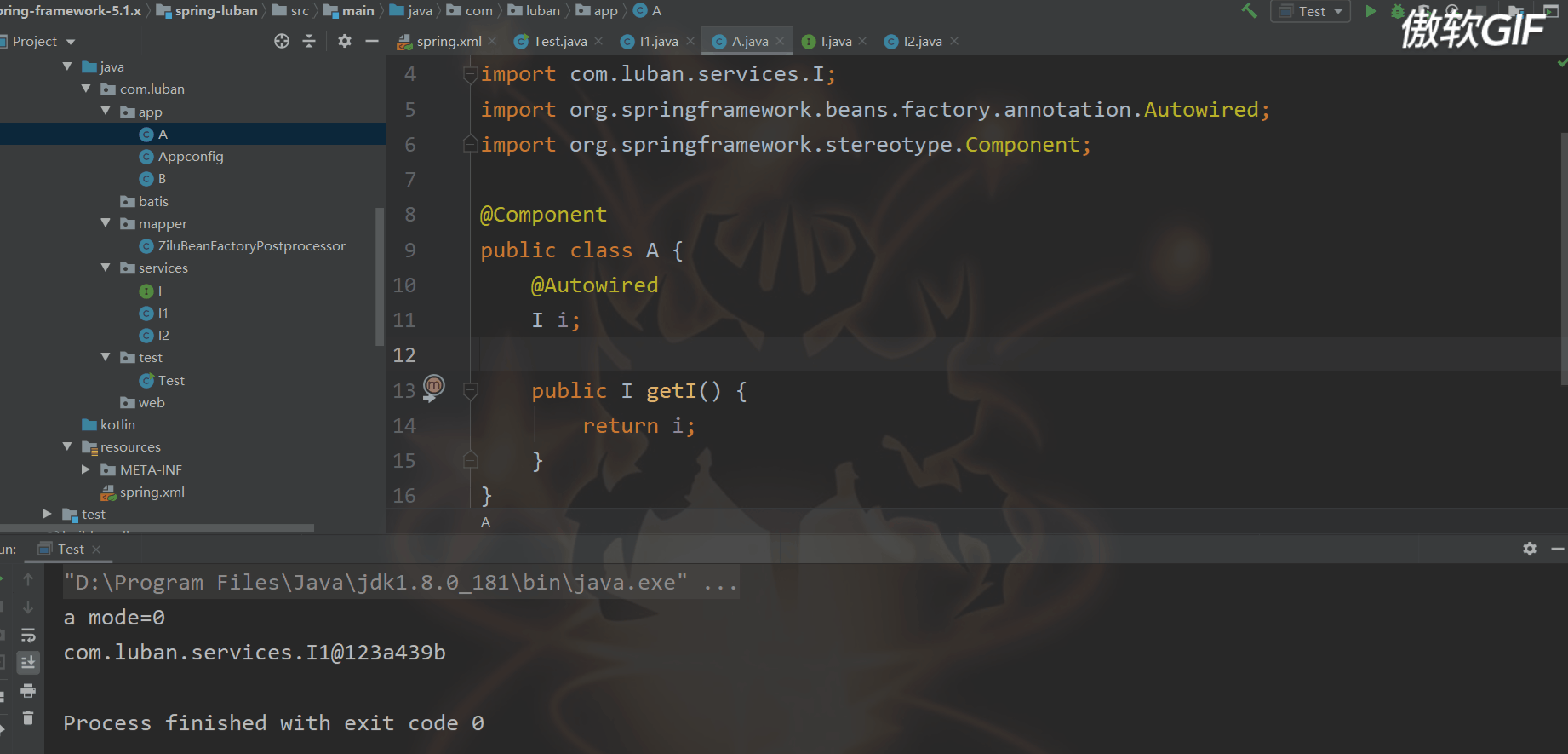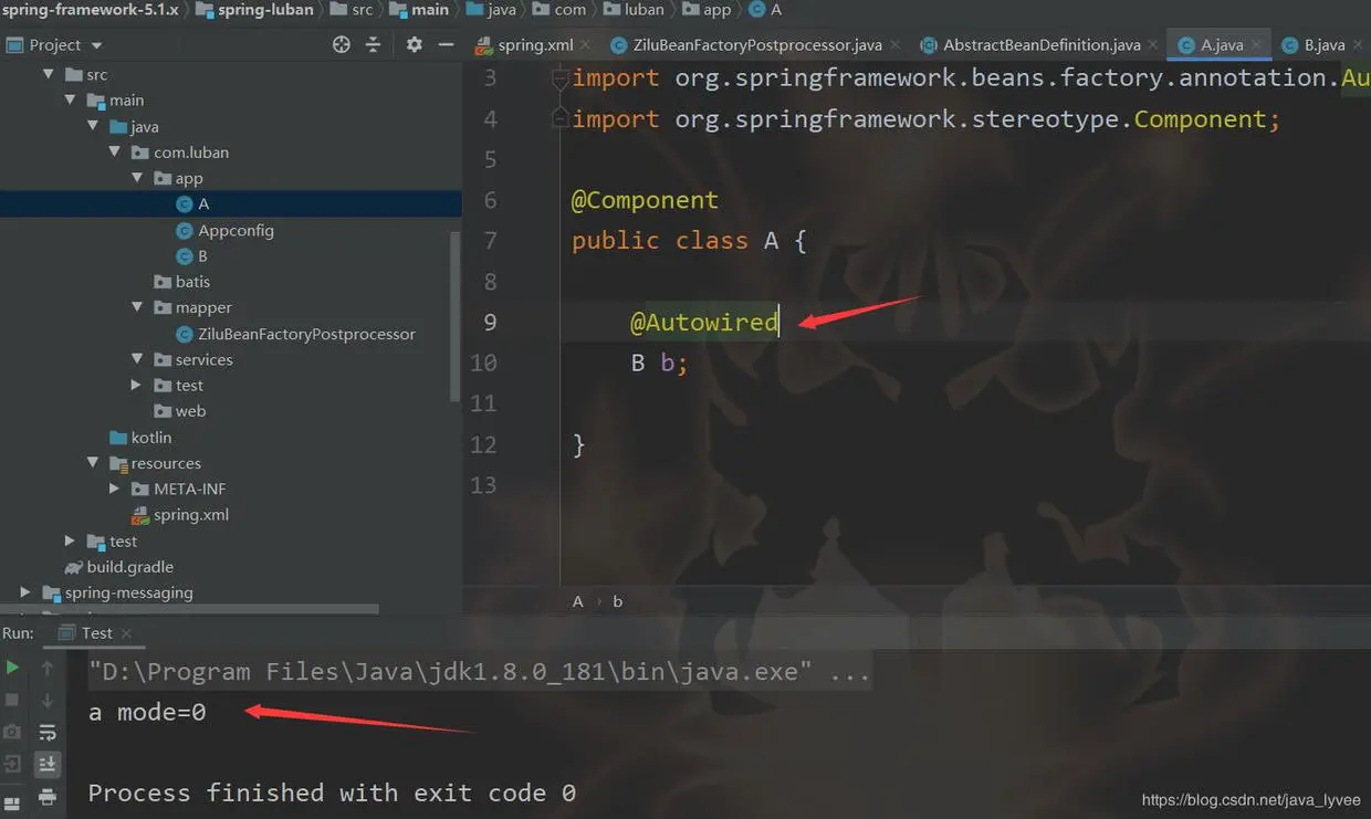 可以看到结果为0,说明这个A类不是自动装配,其实这已经能证明@Autowried不是自动装配了,但是还有更直接的证据证明他不是自动装配,就是通过spring源码当中处理@Autowried的代码可以看出,首先我们写一个bytype的例子看看spring如何处理的