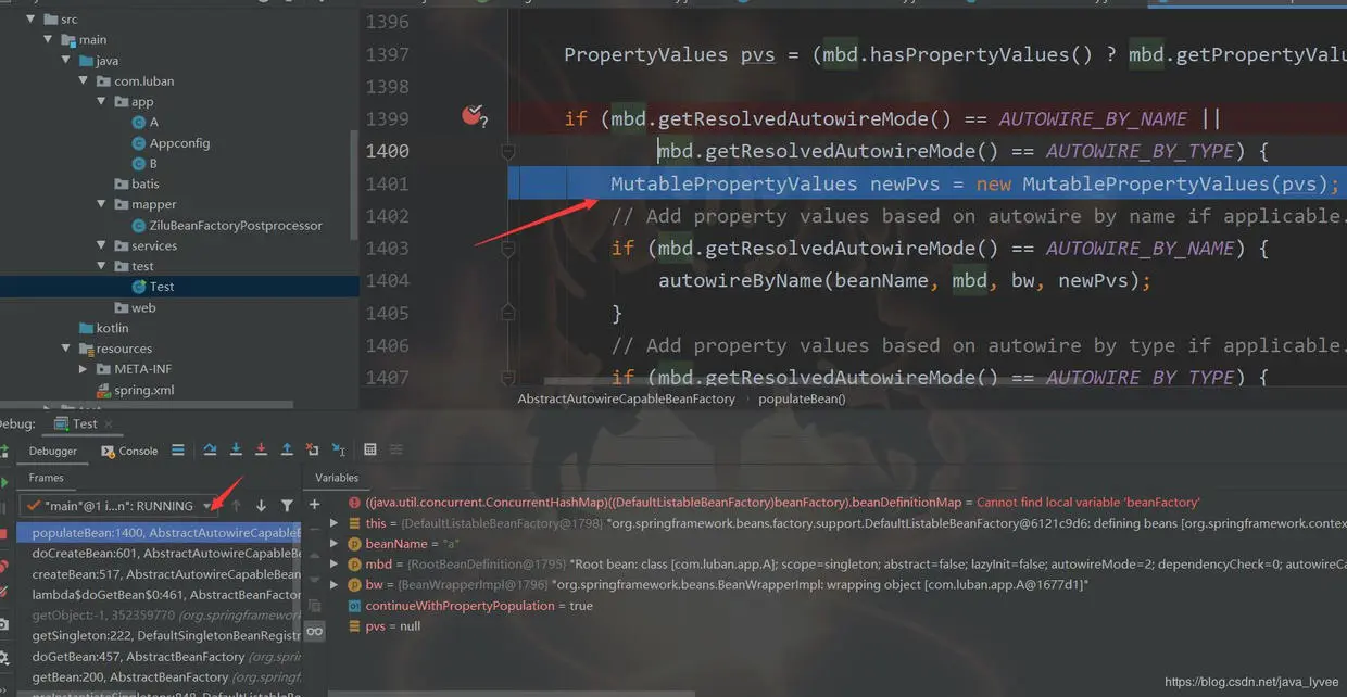 上面代码运行起来,调试spring源码当中的org.springframework.beans.factory.support.AbstractAutowireCapableBeanFactory#populateBean方法,这个方法主要就是完成属性填充的,也就是大家说的注入