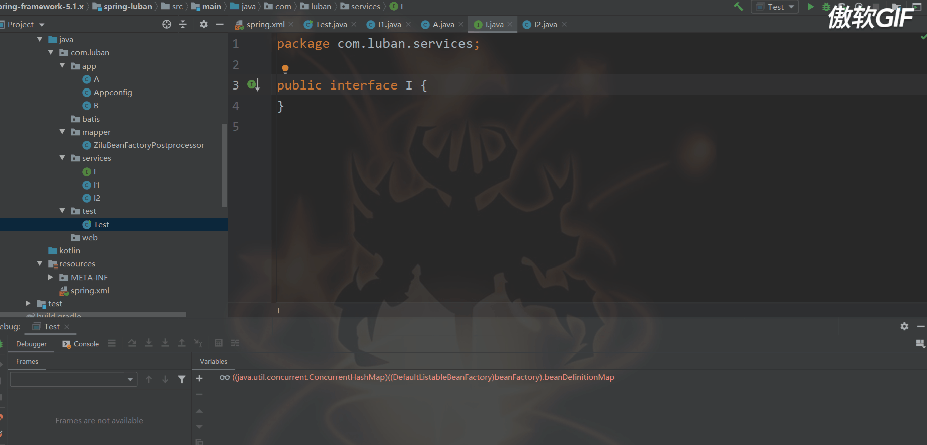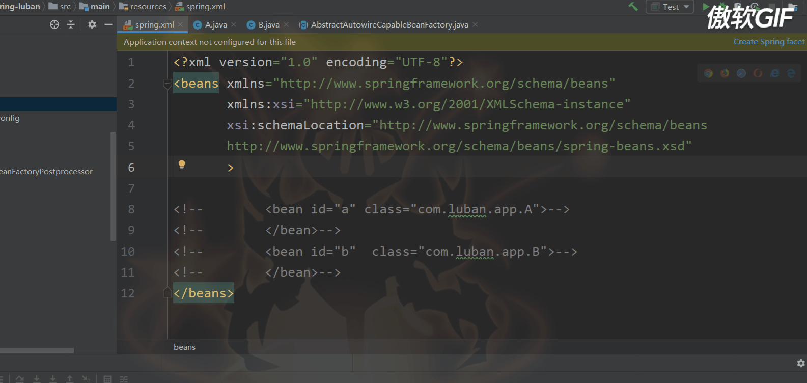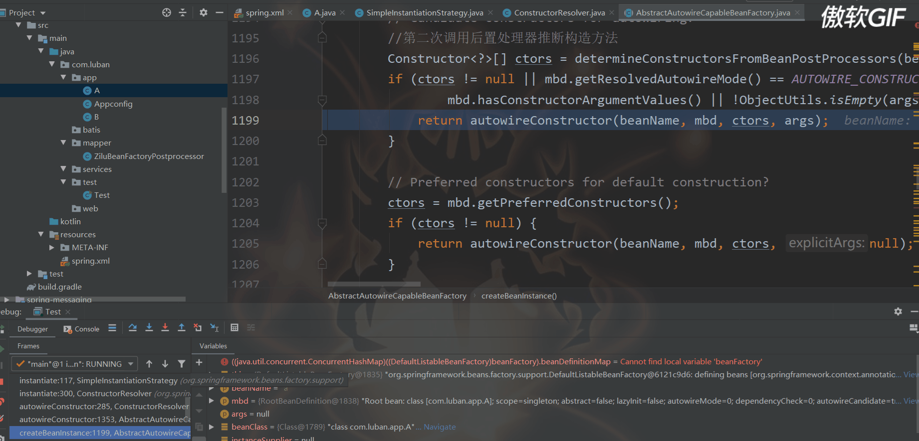 说明一下这个A类的构造方法注入的B是可以注入的,这样算不算注解类的自动注入呢?看起来像,其实本质上他用的也是自动注入的代码实现的,但是笔者还是认为他不是;为什么呢?我们先来分析一下这个b能被注入的原因是什么,同样给一个gif来说明