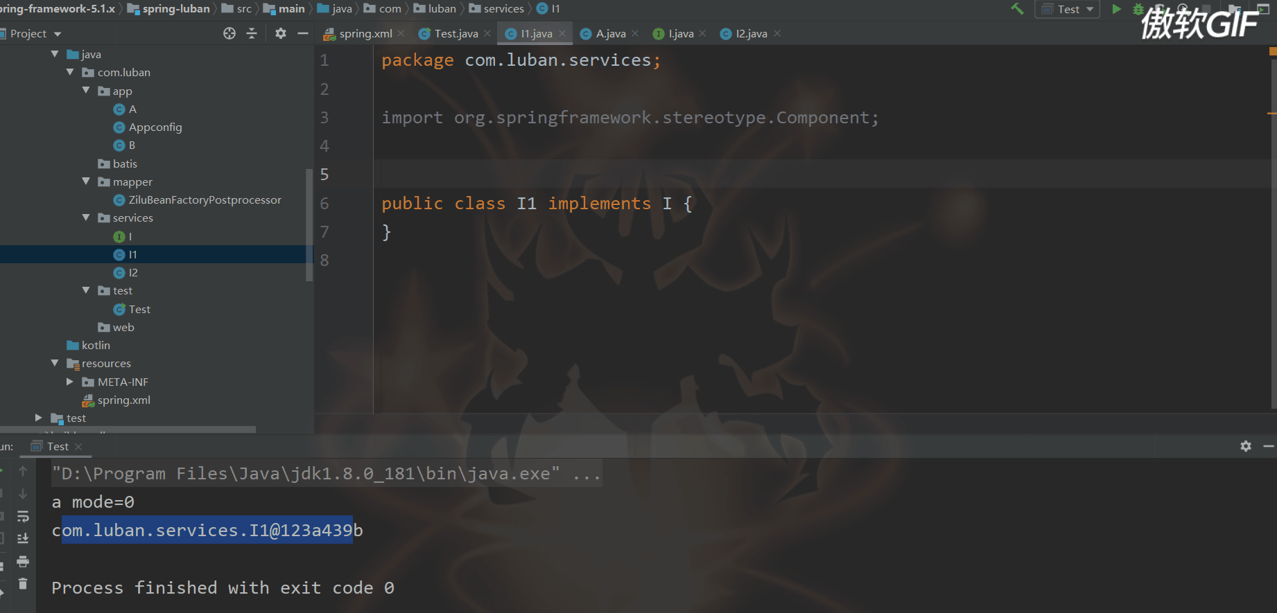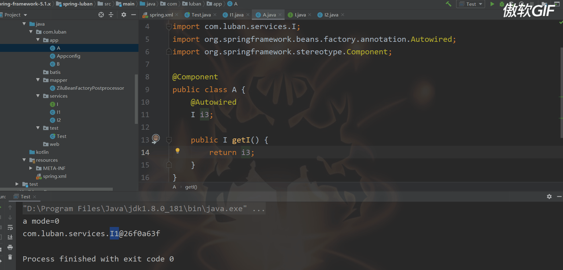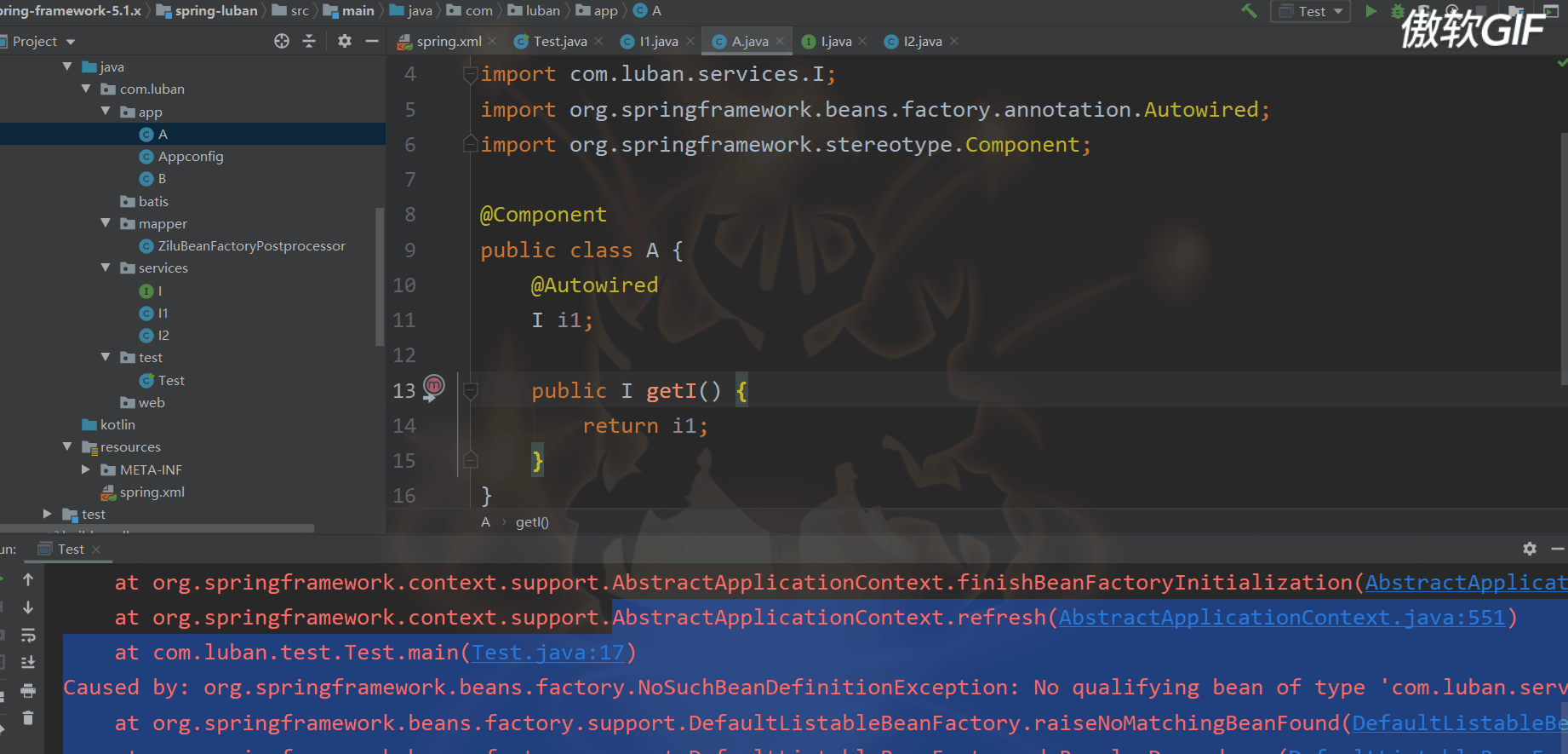 如果先根据类型找到了多个,那么spring不会立马异常,而是根据名字再找去找,如果根据名字找到一个合理的则注入这个合理的,下图就是I1和I2都符合,但是spring最后却没有异常,是因为属性名字叫i1故而先类型在名字找到了合理的;
