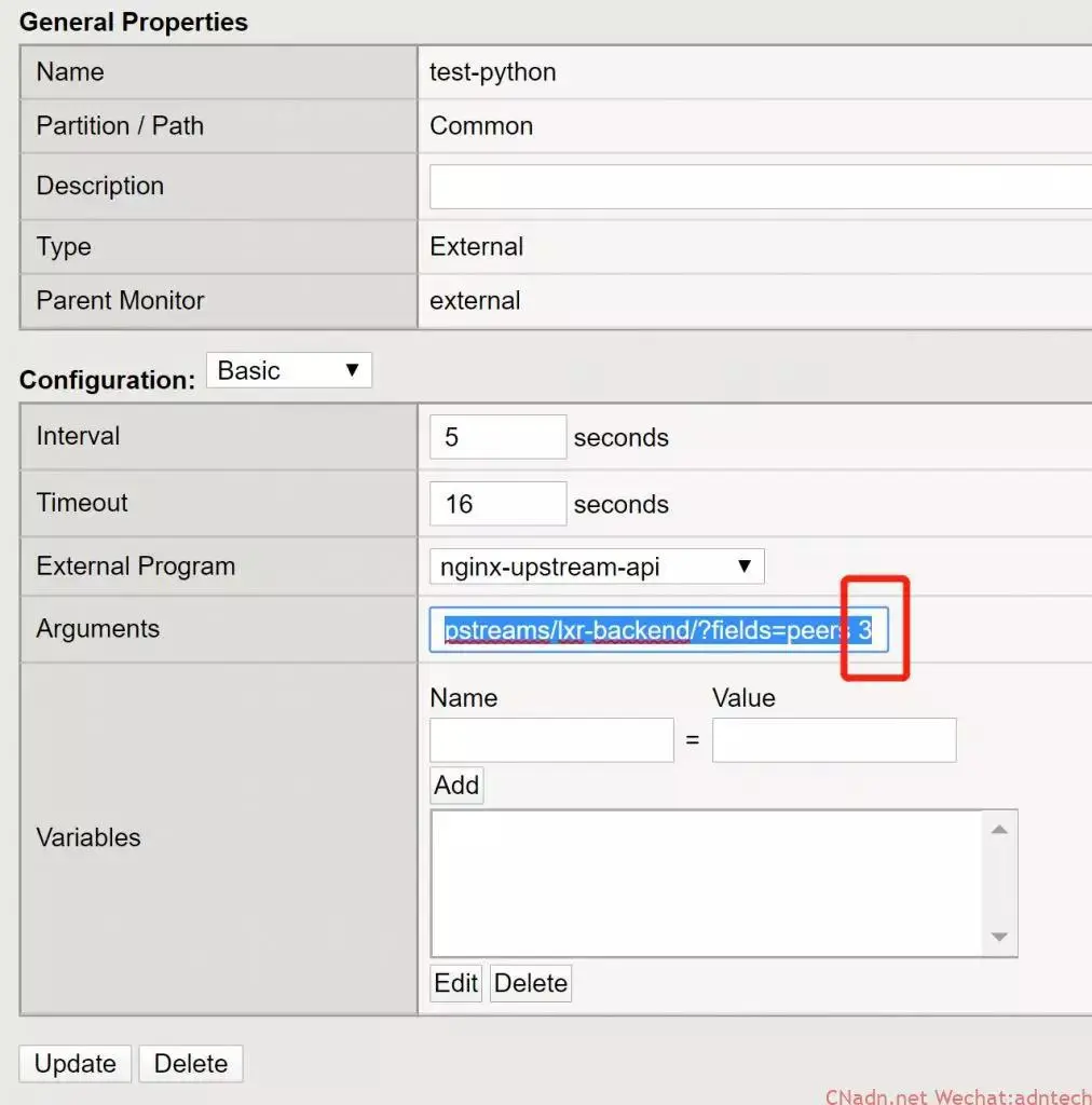 2.返回的内容示例如下,主要关心state: up, 只要获取到总的state: up数量即可 { "peers": [ { "id": 0, "server": "10.0.0.1:8080", "name": "10.0.0.1:8080", "backup": false, "weight": 1, "state": "up", "active": 0, "requests": 3468, "header_time": 778, "response_time": 778, "responses": { "1xx": 0, "2xx": 3435, "3xx": 6, "4xx": 20, "5xx": 4, "total": 3465 }, "sent": 1511086, "received": 99693373, "fails": 0, "unavail": 0, "health_checks": { "checks": 1754, "fails": 0, "unhealthy": 0, "last_passed": true }, "downtime": 0, "selected": "2020-01-03T07:52:57Z" }, { "id": 1, "server": "10.0.0.1:8081", "name": "10.0.0.1:8081", "backup": true, "weight": 1, "state": "unhealthy", "active": 0, "requests": 0, "responses": { "1xx": 0, "2xx": 0, "3xx": 0, "4xx": 0, "5xx": 0, "total": 0 }, "sent": 0, "received": 0, "fails": 0, "unavail": 0, "health_checks": { "checks": 1759, "fails": 1759, "unhealthy": 1, "last_passed": false }, "downtime": 17588406, "downstart": "2020-01-03T03:00:00.427Z" } ] } 3.可以编写如下python脚本: #!/usr/bin/python # -- coding: UTF-8 -- import sys import urllib2 import json def get_nginxapi(url): ct_headers = {'Content-type':'application/json'} request = urllib2.Request(url,headers=ct_headers) response = urllib2.urlopen(request) html = response.read() return html api = sys.argv[3] try: data = get_nginxapi(api) data = json.loads(data) except: data = '' m = 0 lowwater = int(sys.argv[4]) try: for peer in data['peers']: state = peer['state'] if state == 'up': m = m + 1 except: m = 0 #print data['peers'][]['state'] #print m if m >= lowwater: print 'UP'