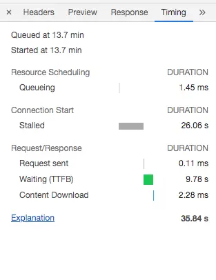 分析了一下每个请求的 Timing之后发现:每个请求的Stalled时间都很久,但是又都可以发送成功。