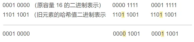 有没有看出来点什么?扩容前和扩容后的 & 计算值差别就只是元素 hash 值中和原容量 16 二进制表示中的那个 1 的位置是 0 还是 1 有关。