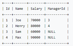 Employee 表包含所有员工,他们的经理也属于员工。每个员工都有一个 Id,此外还有一列对应员工的经理的 Id。