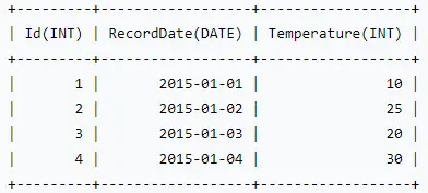 给定一个 Weather 表,编写一个 SQL 查询,来查找与之前(昨天的)日期相比温度更高的所有日期的 Id。
