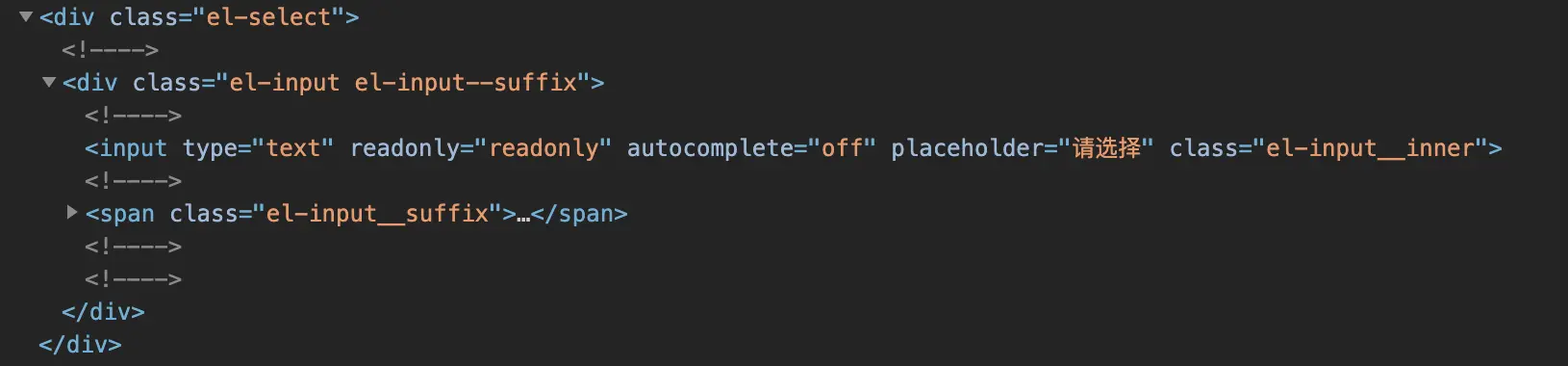 首先最外层,是一个类名为 el-select 的 div,如果声明了 size,还会根据 size 添加 el-select-size 类,里面包裹着的是 el-select__tags 的 div,我们暂时先不看与 tags 相关的,先看一下 el-input。