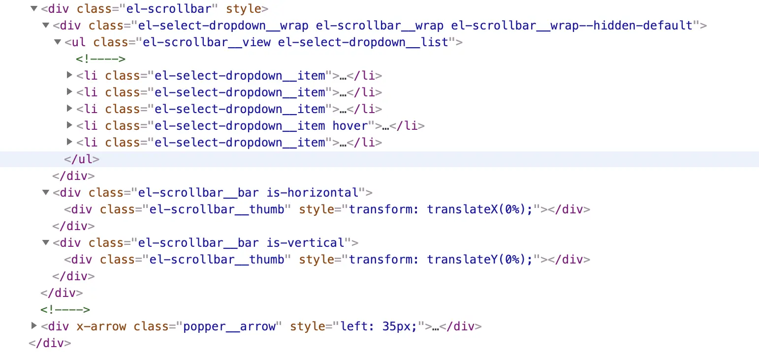 首先是 el-select-menu,查看导入的模块可知使用的是 select-dropdown.vue 文件,进去瞅一眼。这个组件的结构很简单,只有一个 div,里面包含一个插槽,这个 div 的 class 是 "el-select-dropdown el-popper",它渲染到页面上是下面这种结构: