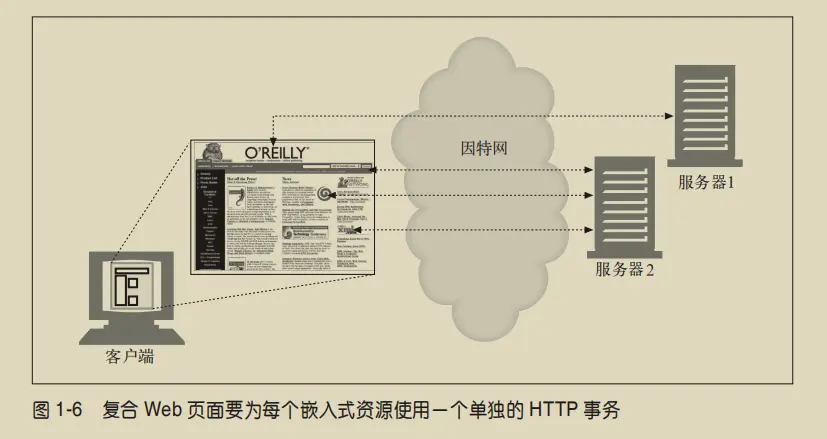 这些嵌入式资源甚至可能位于不同的服务器上,如图 1-6 所示。因此,一个“Web 页面”通常并不是单个资源,而是一组 资源的集合。
