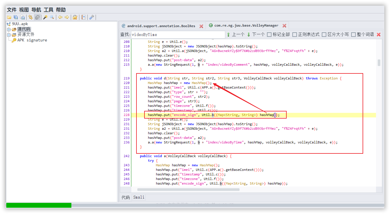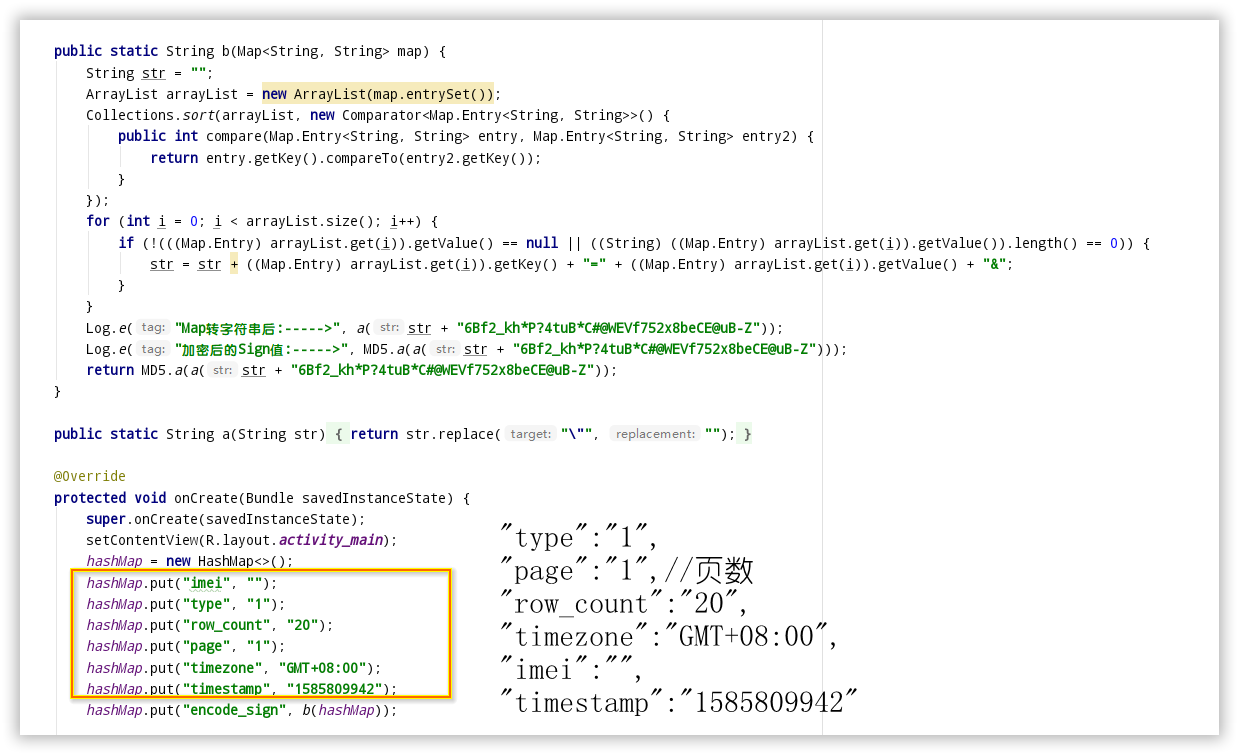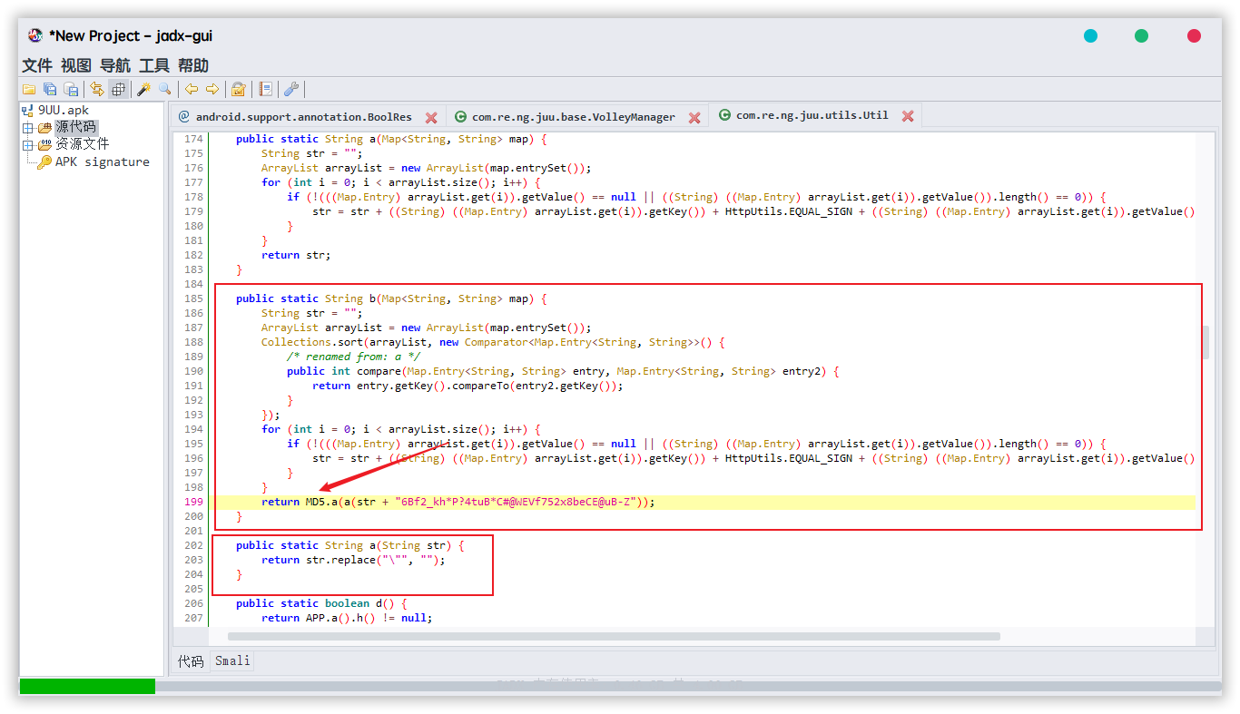 我们继续ctrl直接点击确进去,粗略的看他应该是把Map转化为一个数组,最后数组加上那一串乱码,执行a方法,如果有\就删除最后执行MD5加密(这个地方又) 改一下,上面这个说法有误正确的说法应该是:执行a方法,如果有双引号就删除最后执行MD5加密 str.replace(""", ""); 这里的”\“是转义字符,意思是把字符串中的双引号替换为空
