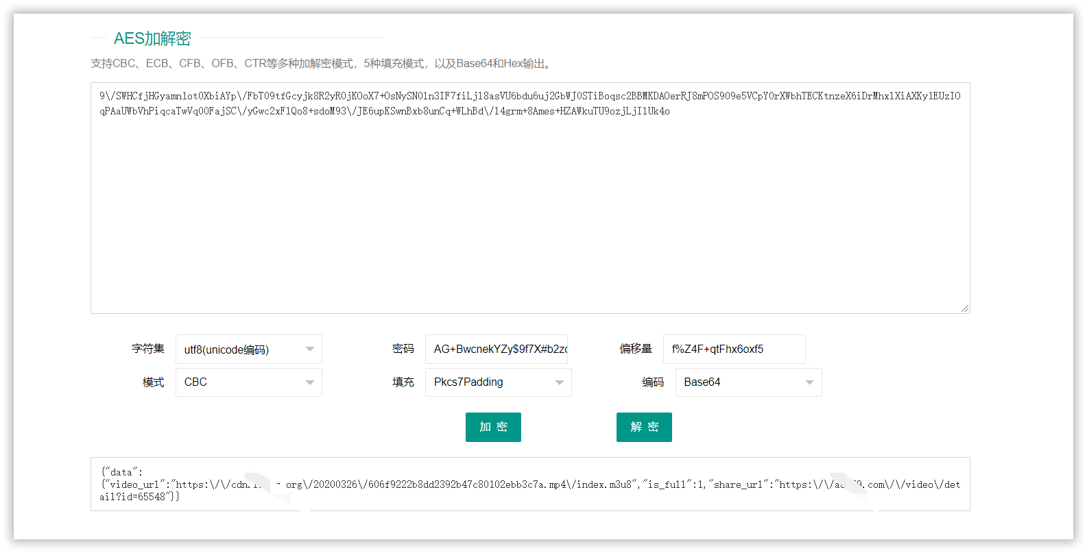 参数解密:{"data":{"video_url":"https:\/\/cdn.iicgs.org\/20200326\/606f9222b8dd2392b47c80102ebb3c7a.mp4\/index.m3u8","is_full":1,"share_url":"https:\/\/aes59.com\/\/video\/detail?id=65548"}}
