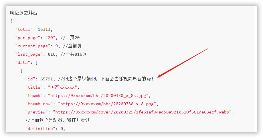 我们发现上面请求参数里面有个vid的值,这个值我尝试之后正好对应上面视频列表中的id值