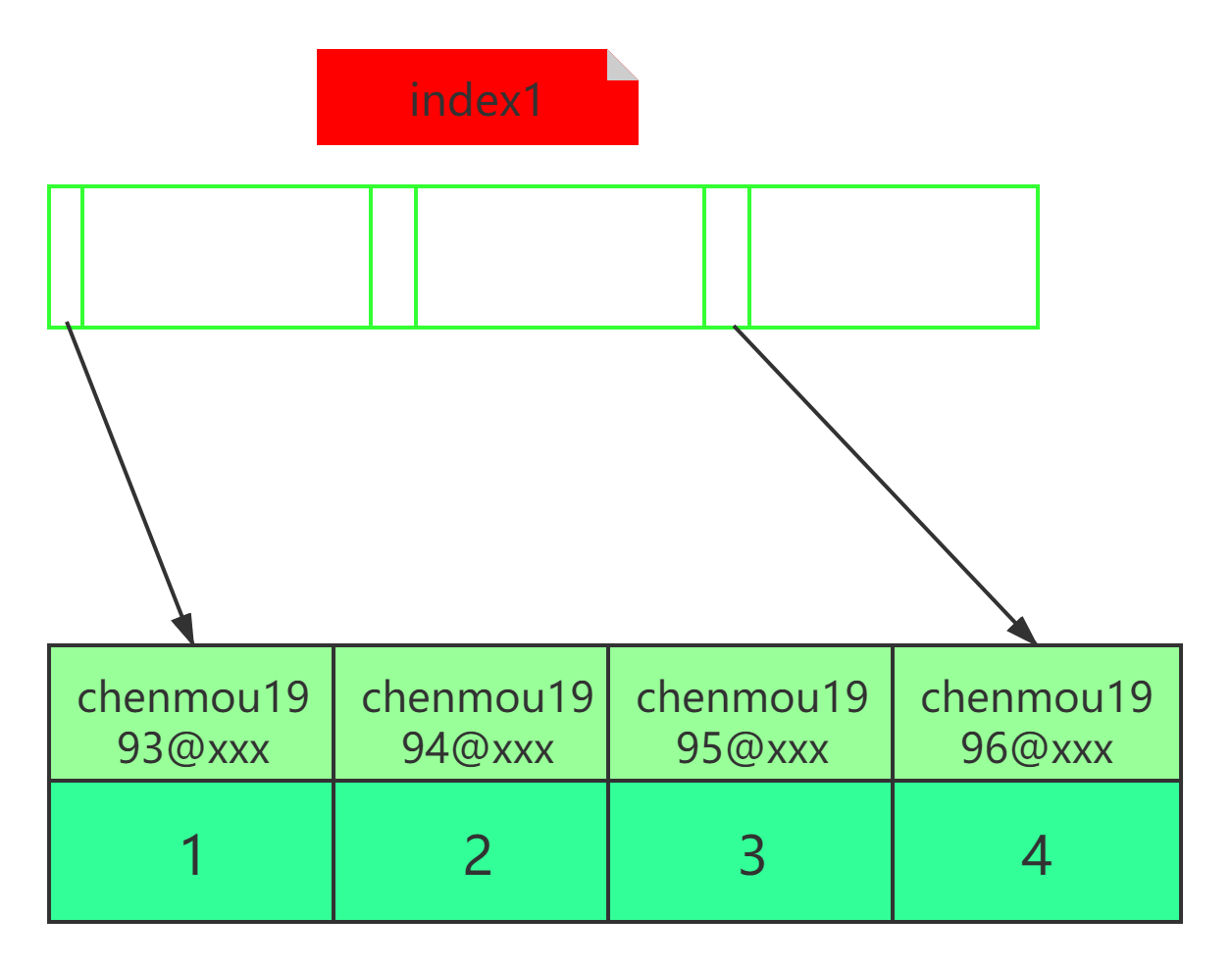 假设有`user`表中有这样几条数据(id,name,email):`(1,"陈某","chenmou1993@xxx")`、`(2,"张某","chenmou1994@xxx")`、`(3,"李某","chenmou1995@xxx")`、`(4,"王某","chenmou1996@xxx")`。