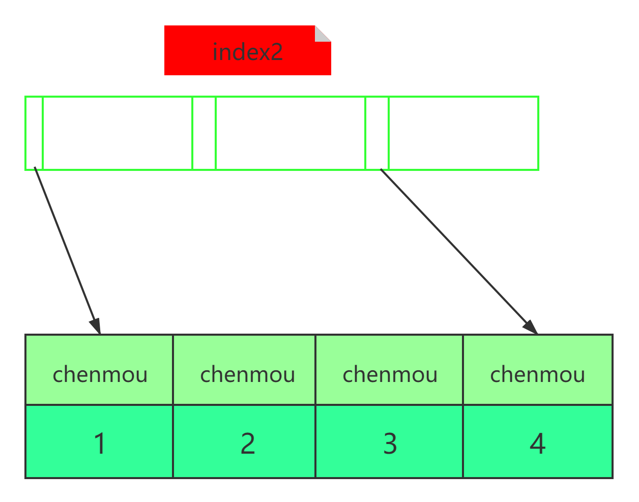 取index2上刚刚查到的位置的下一条记录,发现仍然是`chenmou`,取出id=2,再到ID索引上取整行然后判断,这次值对了,将这行记录加入结果集;