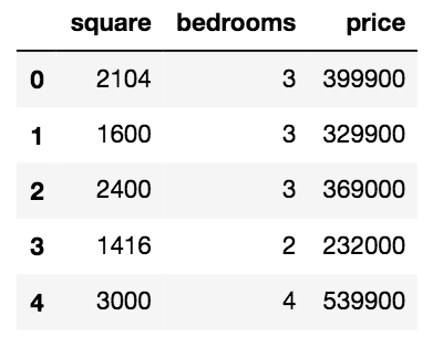 raw_data = pd.read_csv('ex1data2.txt', names = ['square', 'bedrooms', 'price'])