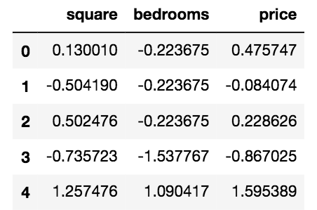 是(max - min),比如用这个公式将所有的房屋面积和卧室数量进行缩放: