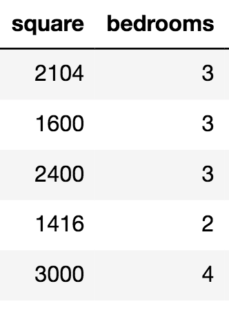 为了简单点,这里假设原始房价数据只有 2 个输入特征,即房屋面积和卧室数量: