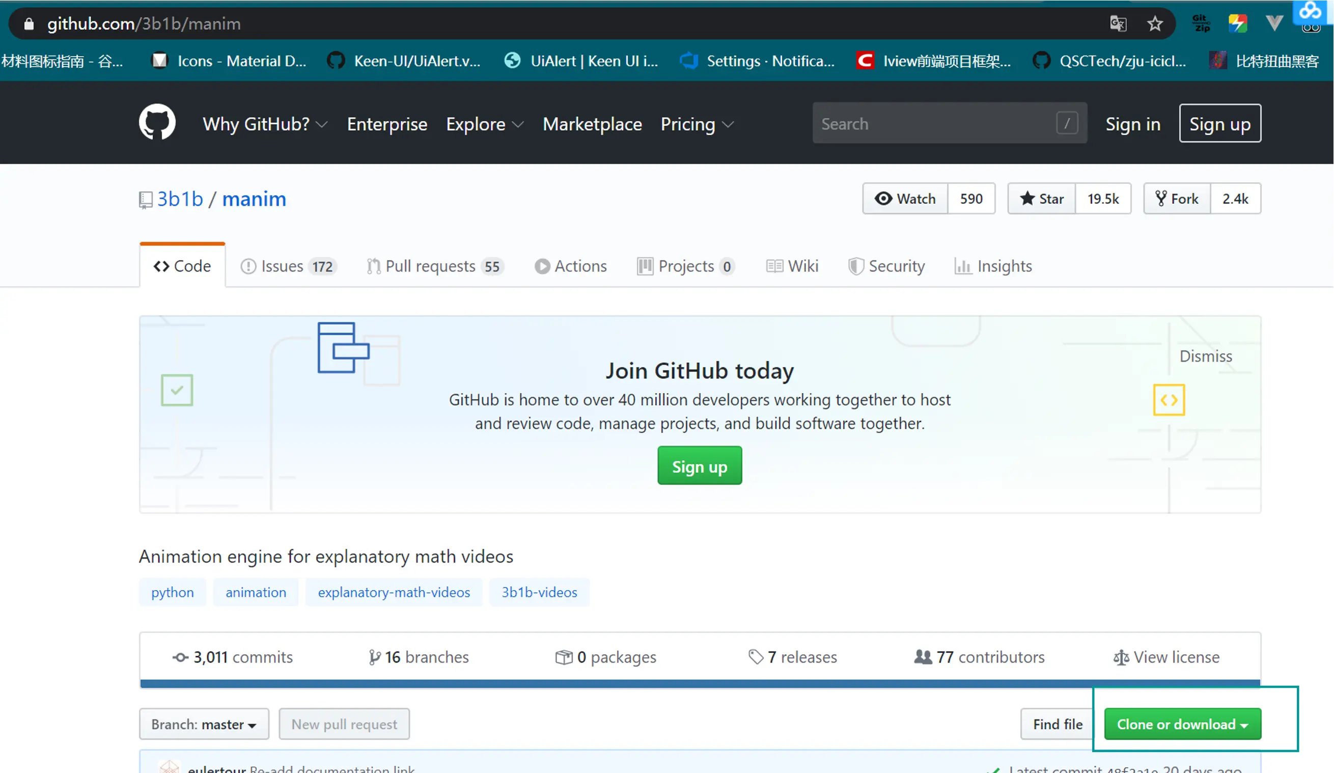 github.com/3b1b/manim 下载zip包