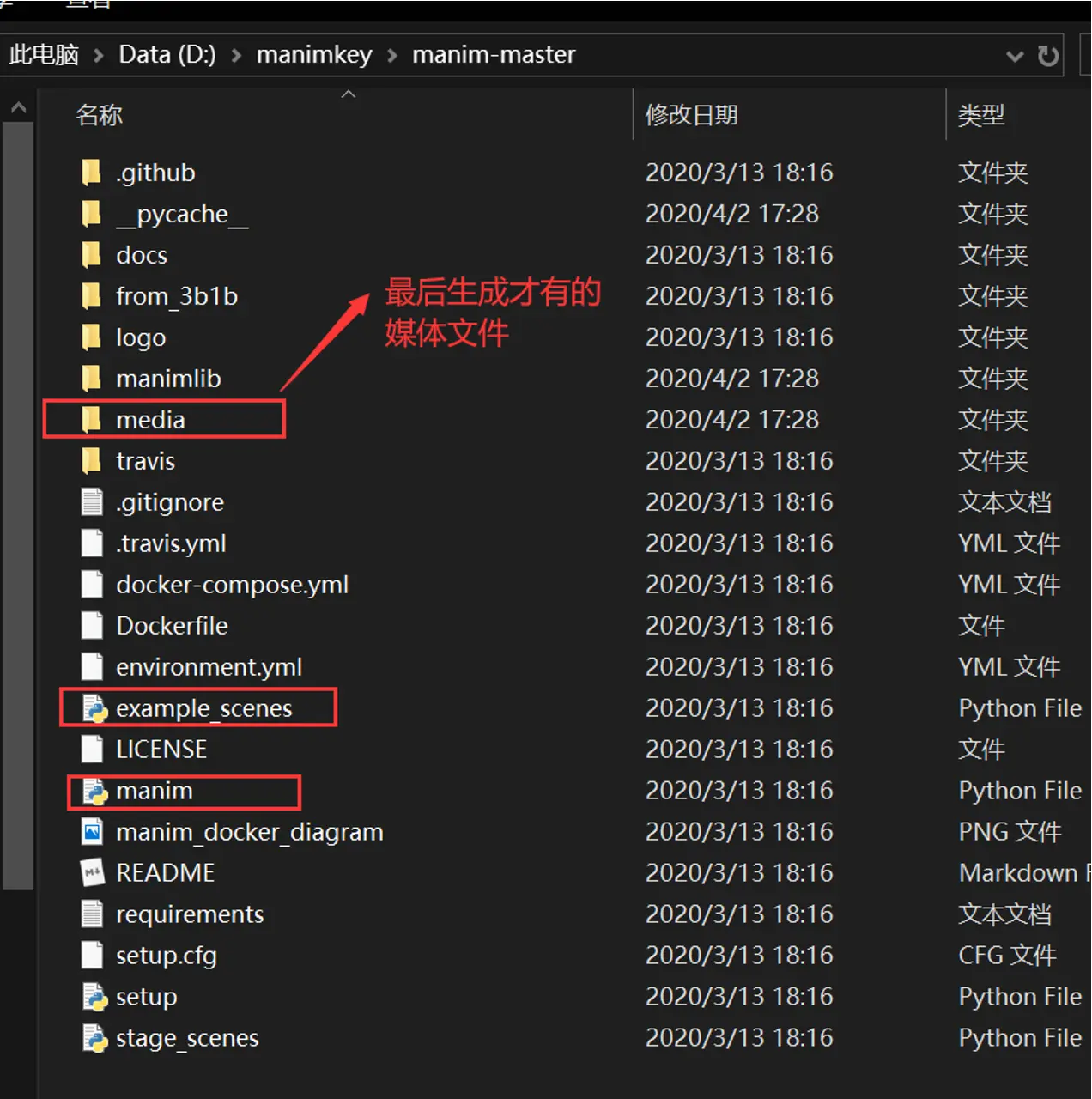 会在当前目录下生成video文件夹,里面保存着输出的视频文件,以及如果有文本的话,还会有一个Tex文件夹