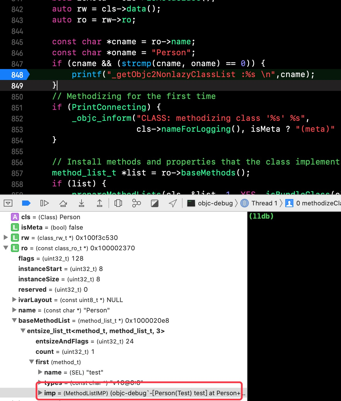 从上面源码处,当我们通过 Class cls = remapClass(cat->cls); 得到了这个类,我们需要精准的对 Person 进行调试,在methodizeClass里面加上一段: