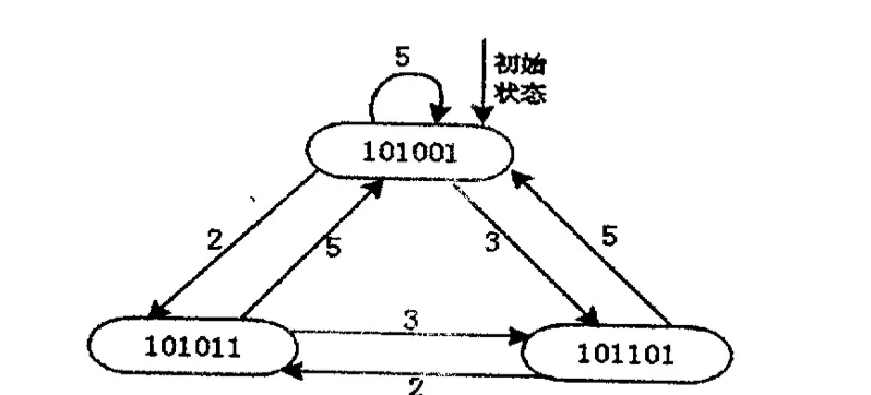 初始冲突向量C = 101001 (比如延迟禁止表中最大元素为6,2进制数长度6位,从 第0位开始,第0位对应禁止表中1,有冲突,故值为1,第4位对应禁止表中4,有冲 突,故为1,同理,第6位也为1,其他位因为无对应禁止表元素,无冲突,故为0)